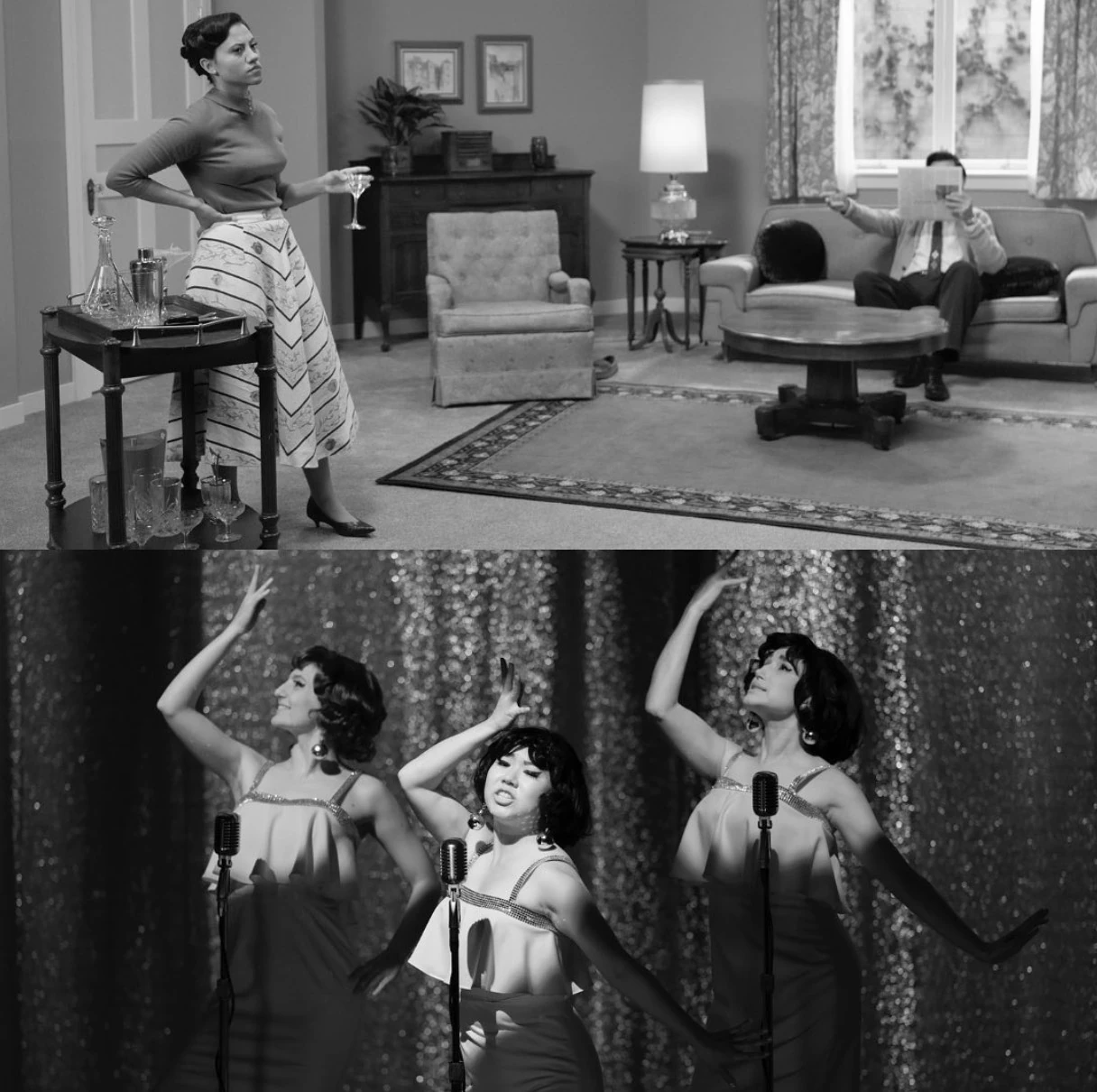 The Pink Ladies stopped by Olivia's house to tell her something important, but she wasn't in a listening mood. She walked away from them only to enter a black and white version of her future life. The three Pink Ladies appeared on the box set TV as performers. Olivia tried to turn off the TV but they simply turned back on. She poured a drink that Leonard took, knit while he read the paper, and did chores. She suddenly grew a large baby bump that transformed into three babies, two of which crawled on the floor while the third screamed in her arms. Fed up, Olivia unplugged the TV and ended their pleas for her not to marry Leonard.[1]