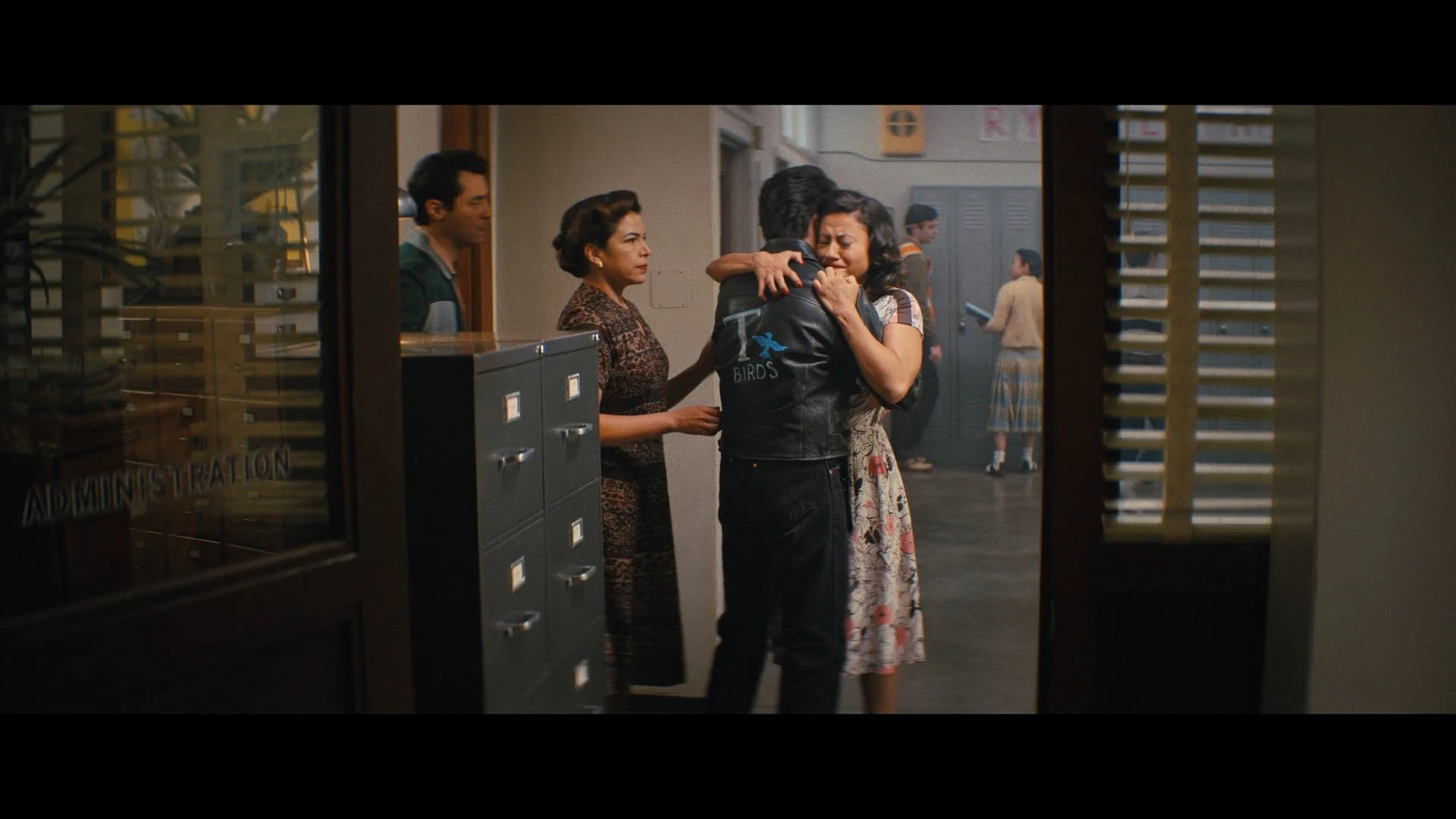 They arrived at the Valdovinos' home which was filled with family. Irene was thrilled to meet Jane, Rydell's first female president who was also Mexican, though Richie clarified she was half Puerto Rican. Jane fumbled over Spanish as she didn't know much, then rambled until Richie invited her to dance. Olivia pulled Jane aside to talk first. After a while, Richie interrupted and pulled Jane out to dance. He encouraged her to not worry about how she was supposed to do it and just go for it, so she did. Cynthia and Nancy stumbled out, drunk. Everyone danced happily to the music and laughed together. Jane danced with Richie then pulled him into the hall where she kissed him twice.