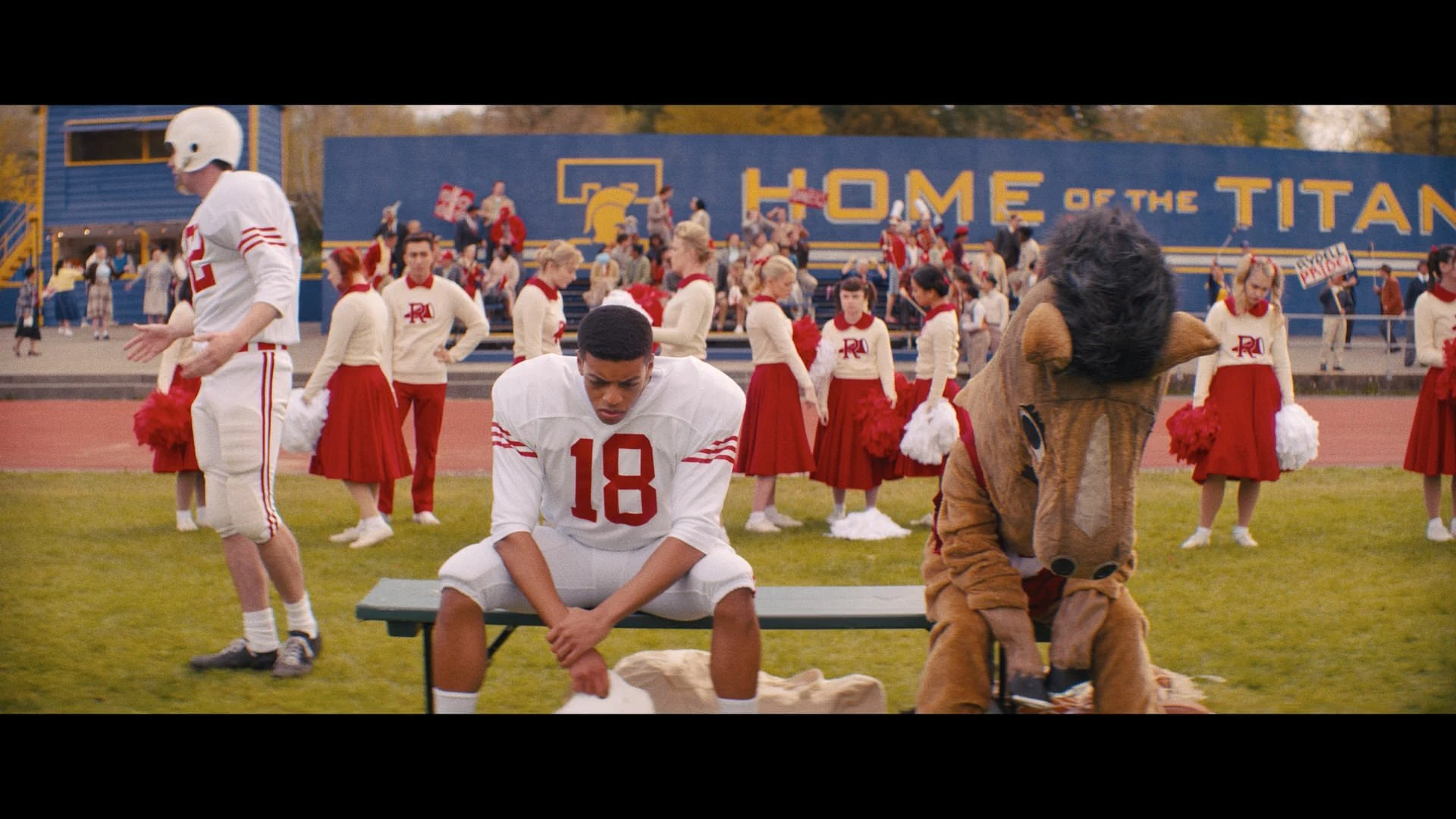 During the game, everyone chanted Wally's name and Rosemary told the referee who he was, including that he was her boyfriend. He was tackled shortly after the snap and the Titans scored a touchdown. The Rangers were down hard and Wally confided in Rowdy, the mascot, about how no one benched Buddy when he did badly. Wally felt he was good for one thing at this school and just flat-lined it. She put a hoof on his back and admitted it wasn't in his head. He recognized her voice as Nancy, but she insisted on no names. This was hard because he was popular, but he would get used to it. Kids used to throw rocks at her and called her slurs because they blamed her for World War II. After her pep talk, Nancy tackled one of the players and unmasked herself while the cheerleaders loudly booed. The Pink Ladies were shocked to see their friend, while Wally asked to be put back in and scored the first touchdown.